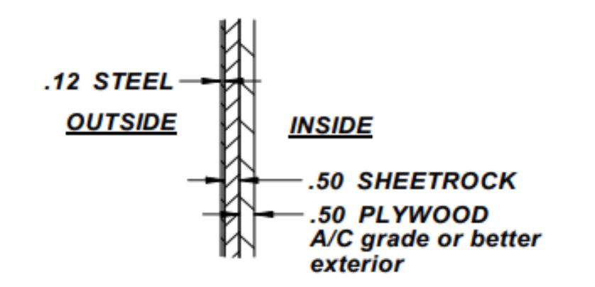 Interior Lining: 1/2” sheetrock layer, 1/2” A/C grade plywood layer